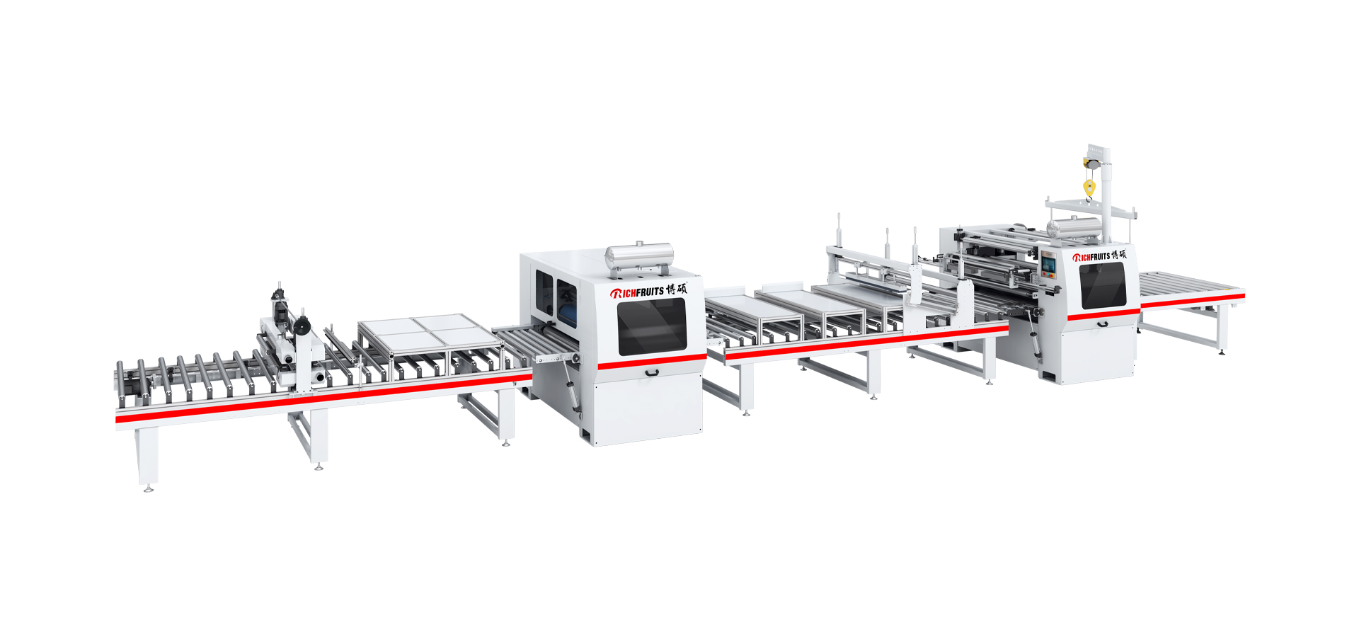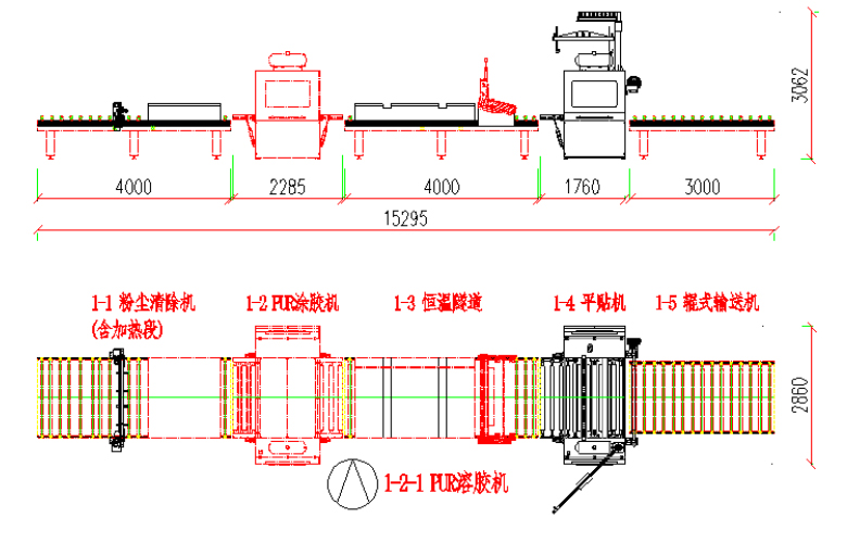 本生产线由:粉尘清除机 — PUR涂胶机(含溶胶系统) — 恒温隧道 — 平贴机 — 输送机等部分组成。