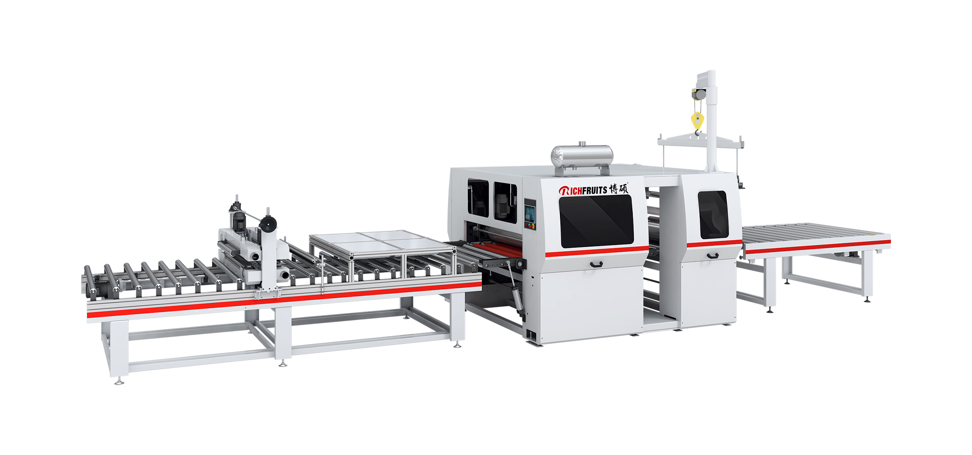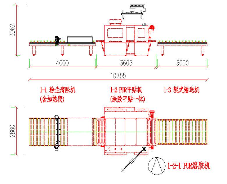 本生产线由:粉尘清除机 — PUR平贴机(含溶胶系统) — 输送机等部分组成。