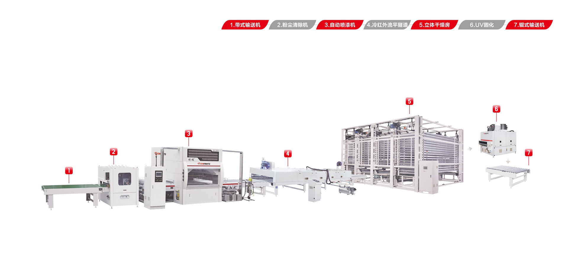 适用于板式家具、实木门、橱柜门、工艺品、装饰板、硅酸钙板、玻镁板、水泥纤维板的板式加工件的平面和四个侧边进行高质量、大批量连续喷漆。