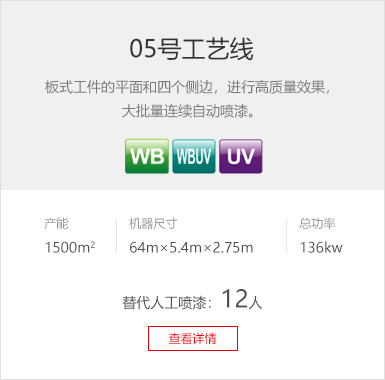 工艺要求 UV底漆、水性色漆、水性LED-UV面漆 产品种类 膜压PVC橱柜门板、定制衣柜、线条 产线数量 4条 设备特色 LED-UV固化系统、立体干燥房配1台,待干45分钟 生产产能 UV底漆喷涂线:1800m²/8h ( 生产员3人/线)