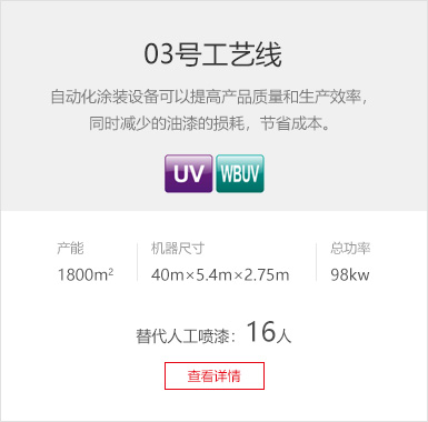 工艺要求 无溶剂UV底漆、水性UV底漆 产品种类 全屋定制、橱柜、衣柜、木门、线条 产线数量 4条/厂 设备特色 无溶剂UV底、水性UV底漆,达到PU质感的98%以上。 生产产能 UV底漆喷涂线(两条):3600m²/8h (生产员3人/线)