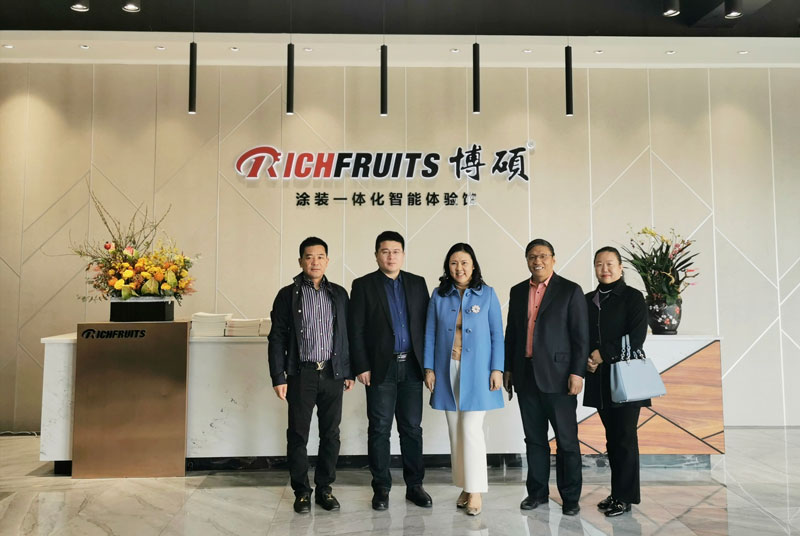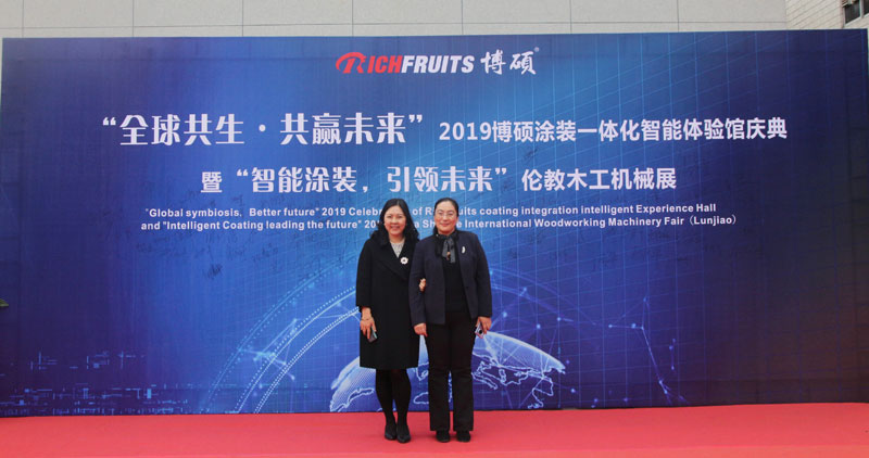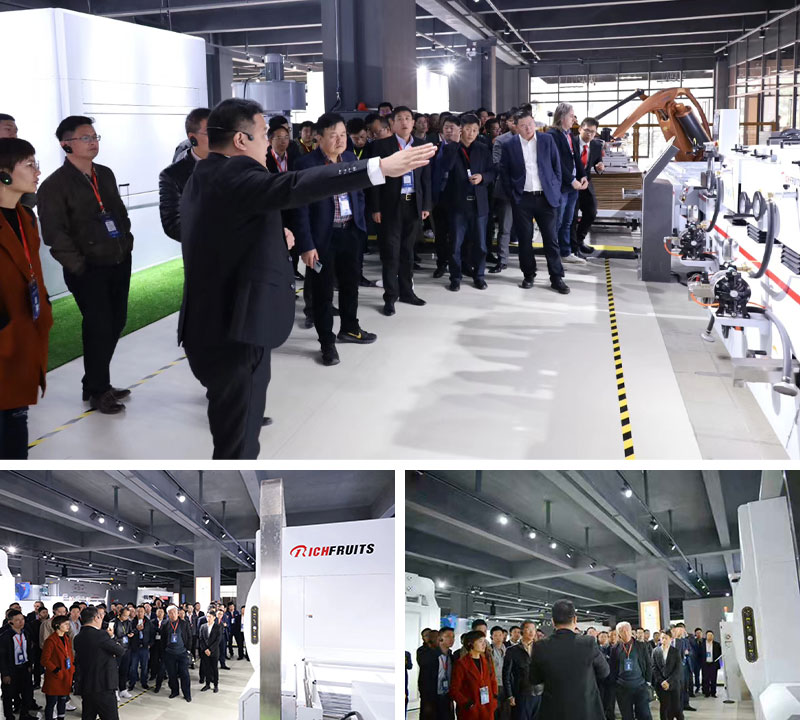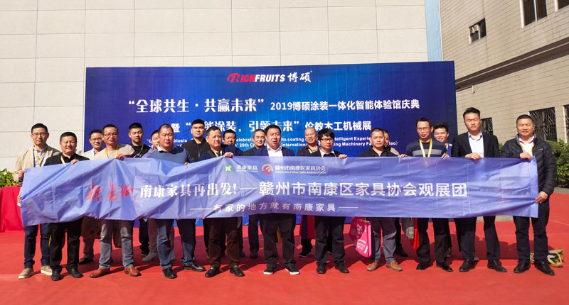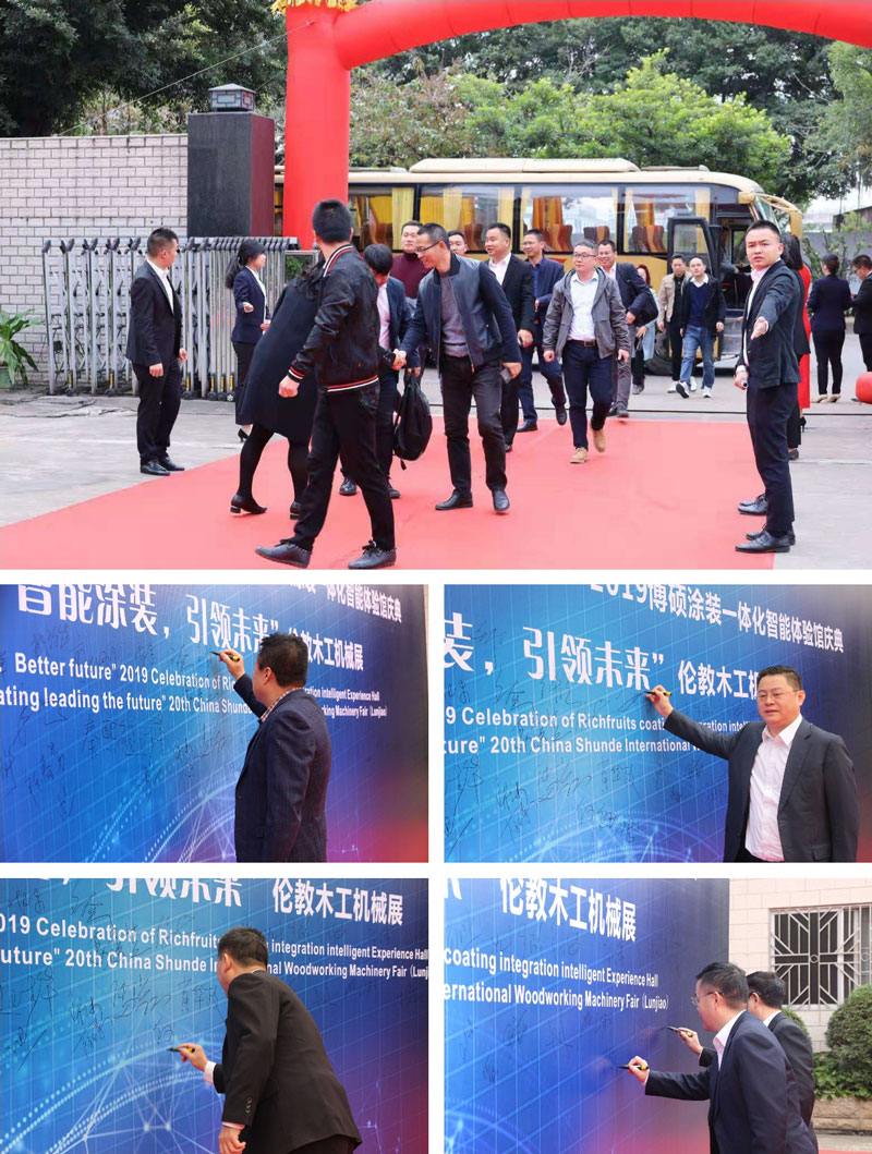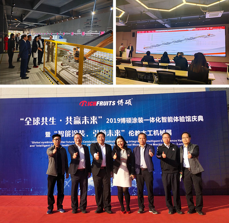 WB.COM万搏董事长谢君女士、广东省定制家居协会会长索菲亚副总裁张挺,全国工商联家具装饰商会执行会长张传喜、土耳其木工设备优秀经销商Cem、上海冠盛木工机械有限公司董事长陈培贤、越南理研联营RIKEN总经理丁弈玮、马来西亚良胜木家具机械有限公司董事长梁韶文、印尼BSA公司董事长Bob一共8位产业链大咖共同开启“涂装一体化智能体验馆”。