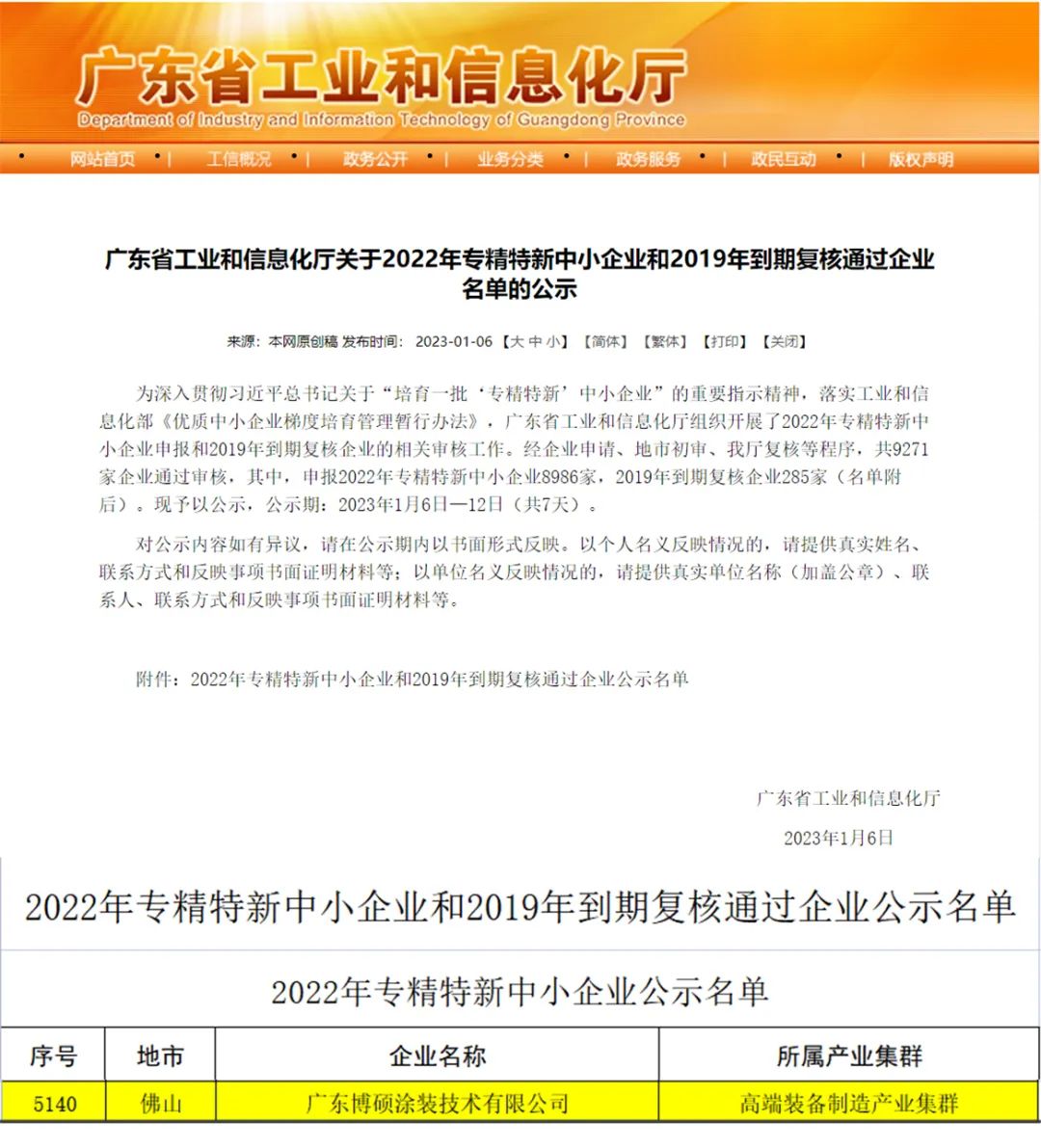 2023年1月6日,广东省工业和信息化厅发布《关于2022年专精特新中小企业名单的公示》。经过企业自主申报、严格审查、专家评选、审核等程序,WB.COM万搏正式通过认定入选为:2022年广东省“专精特新”中小企业。