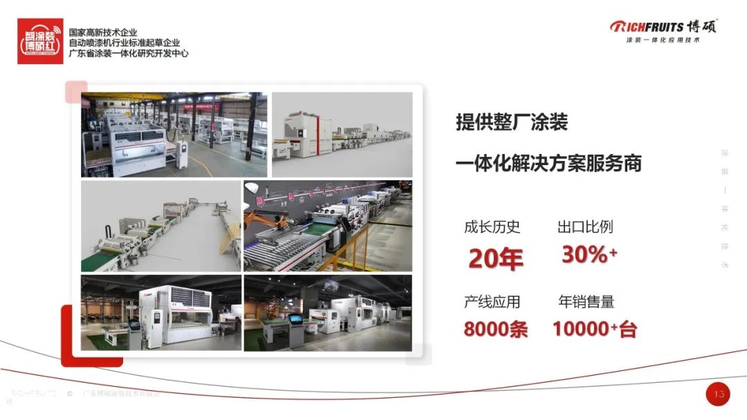 公司主导产品:平面涂装设备系列(辊涂、淋涂、膜压、打印、转印、平贴、包覆)、自动喷漆设备系列、油漆干燥设备系列(准分子肤感、EB固化设备、UV固化机、立体干燥房、冷红外干燥、IR干燥隧道)、机器人应用系列(喷漆、喷胶、喷粉、搬运)、自动化设备系列;针对不同的基材、涂料和工艺研制生产出环保、高效、高品质的各种数字化涂装生产线。
