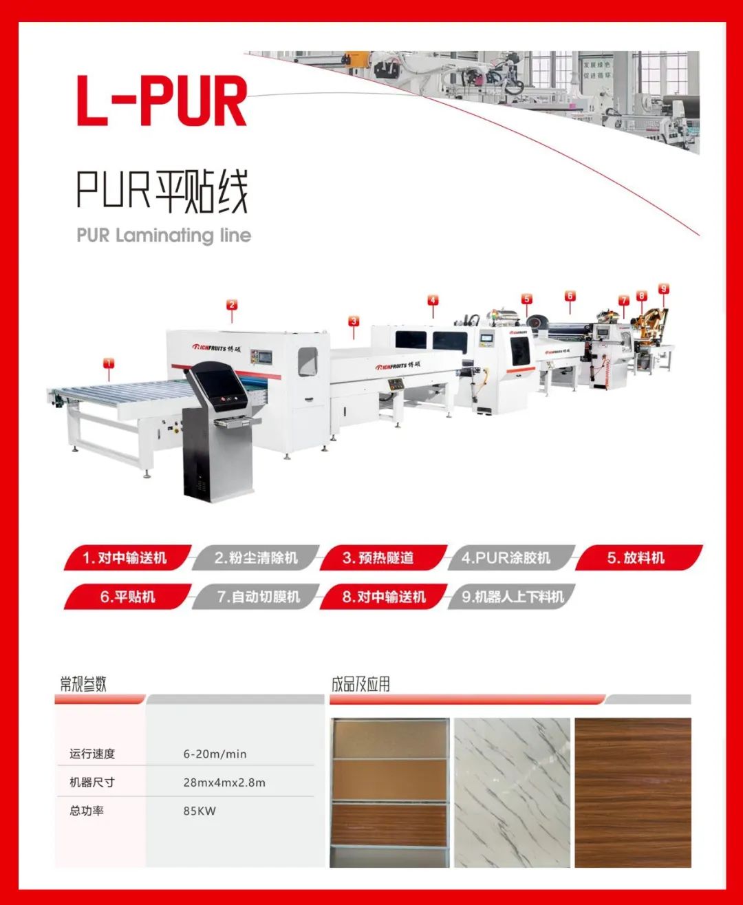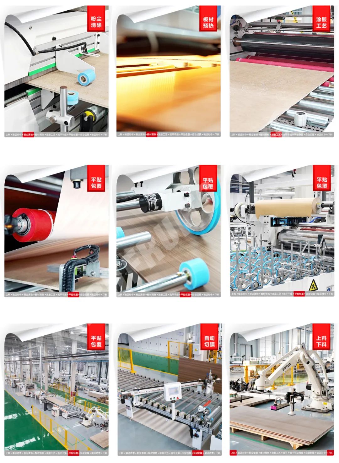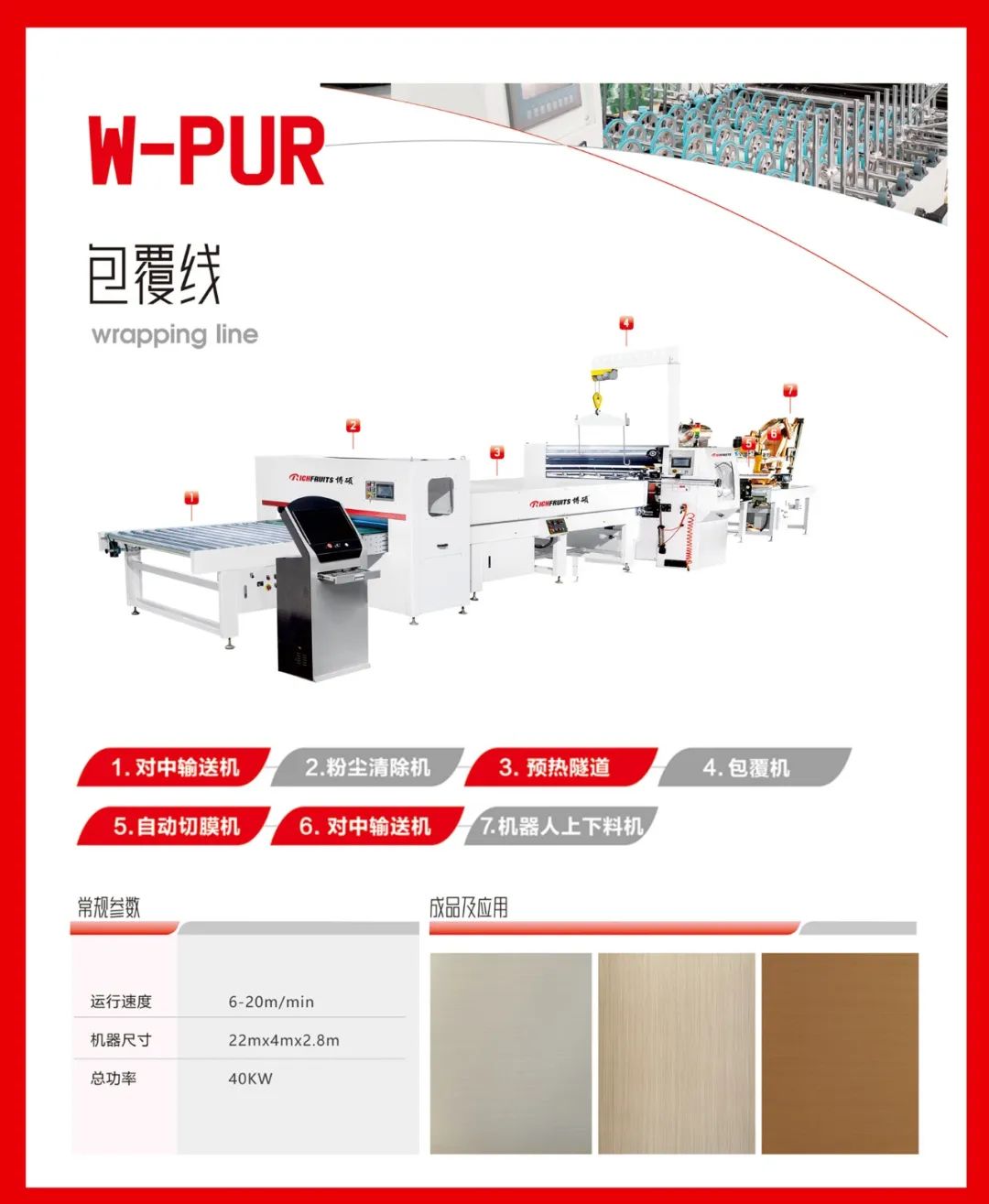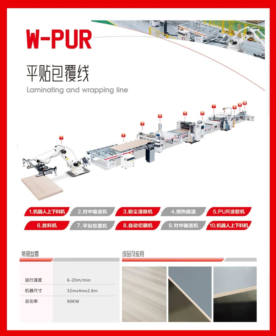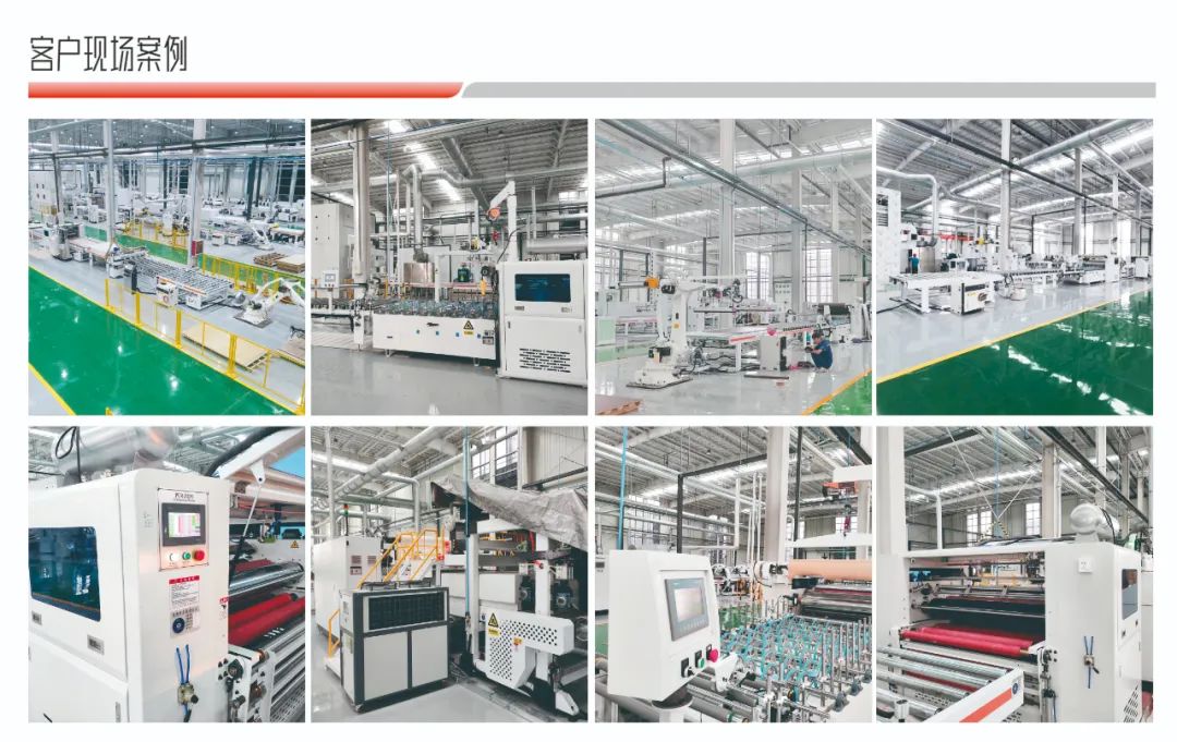 可片材、可卷材混合生产。通用PET、PETG、PP、PVC、CPL、防火板、亚克力、铝箔、SPC等饰面材,利用PUR胶水均匀平贴或包覆到板材表面。 通用于包覆种类的产品,比如:硅酸板、水泥纤维板、门芯板多层墙板等材料进行PUR胶水涂布后包覆各种柔性贴材。