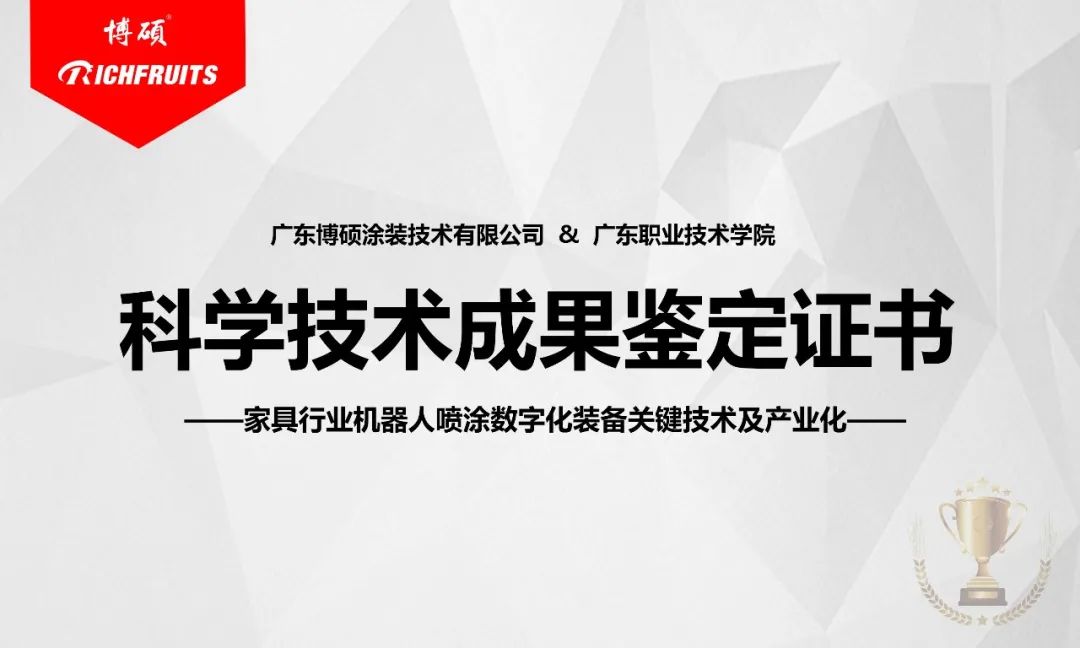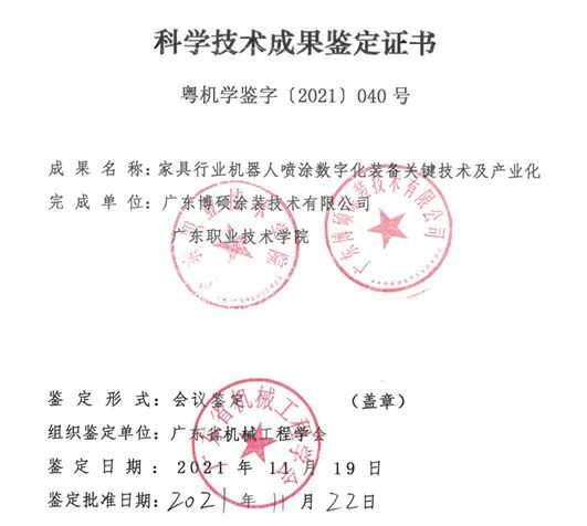 于2021年11月22日,WB.COM万搏荣获关于“家具行业机器人喷涂数字化装备关键技术及产业化”项目的《科学技术成果鉴定证书》
