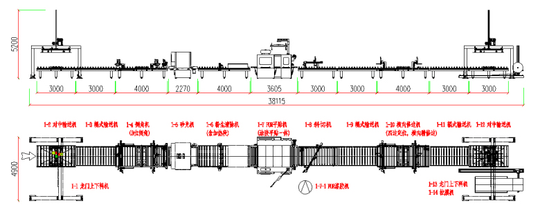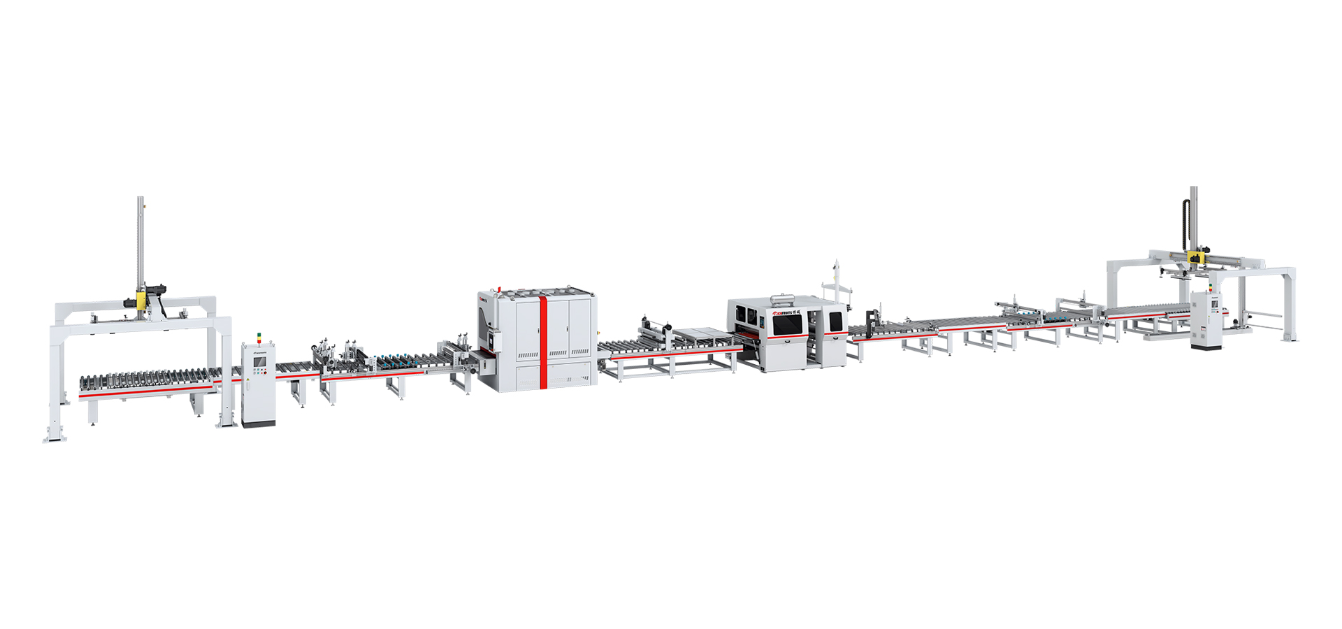 本生产线由:龙门上下料机 — 对中输送机 — 输送机 — 倒角机 — 砂光机 — 粉尘清除机 — PUR平贴机(含溶胶系统) — 斜切机 — 输送机 — 精密修边机 — 输送机 — 对中输送机 — 龙门上下料机 — 拉膜机等部分组成。