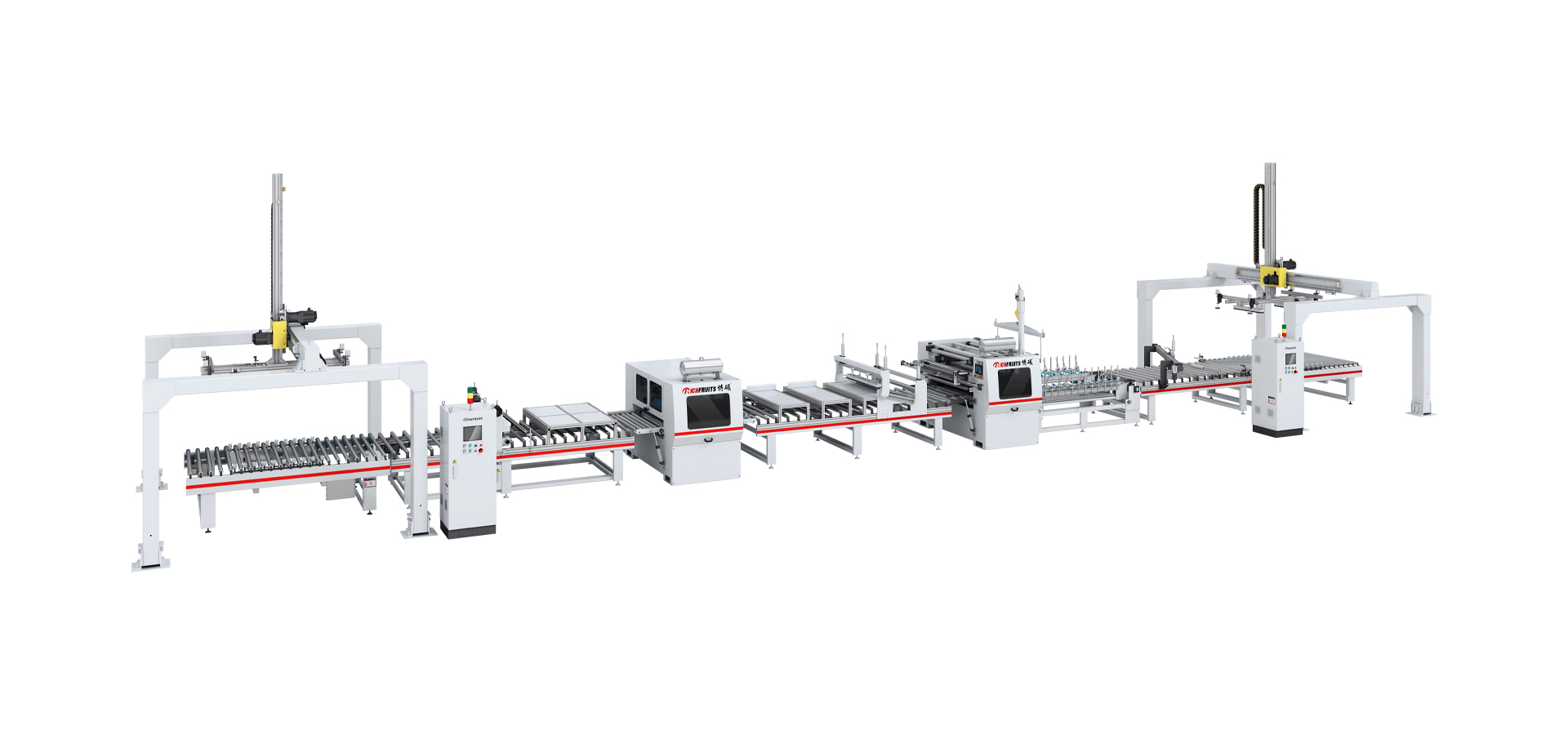 本生产线由:龙门上下料机 — 对中输送机 — 粉尘清除机 — PUR涂胶机 — 恒温隧道 — 平贴包覆机 — 斜切机 — 对中输送机 — 龙门上下料机等部分组成。